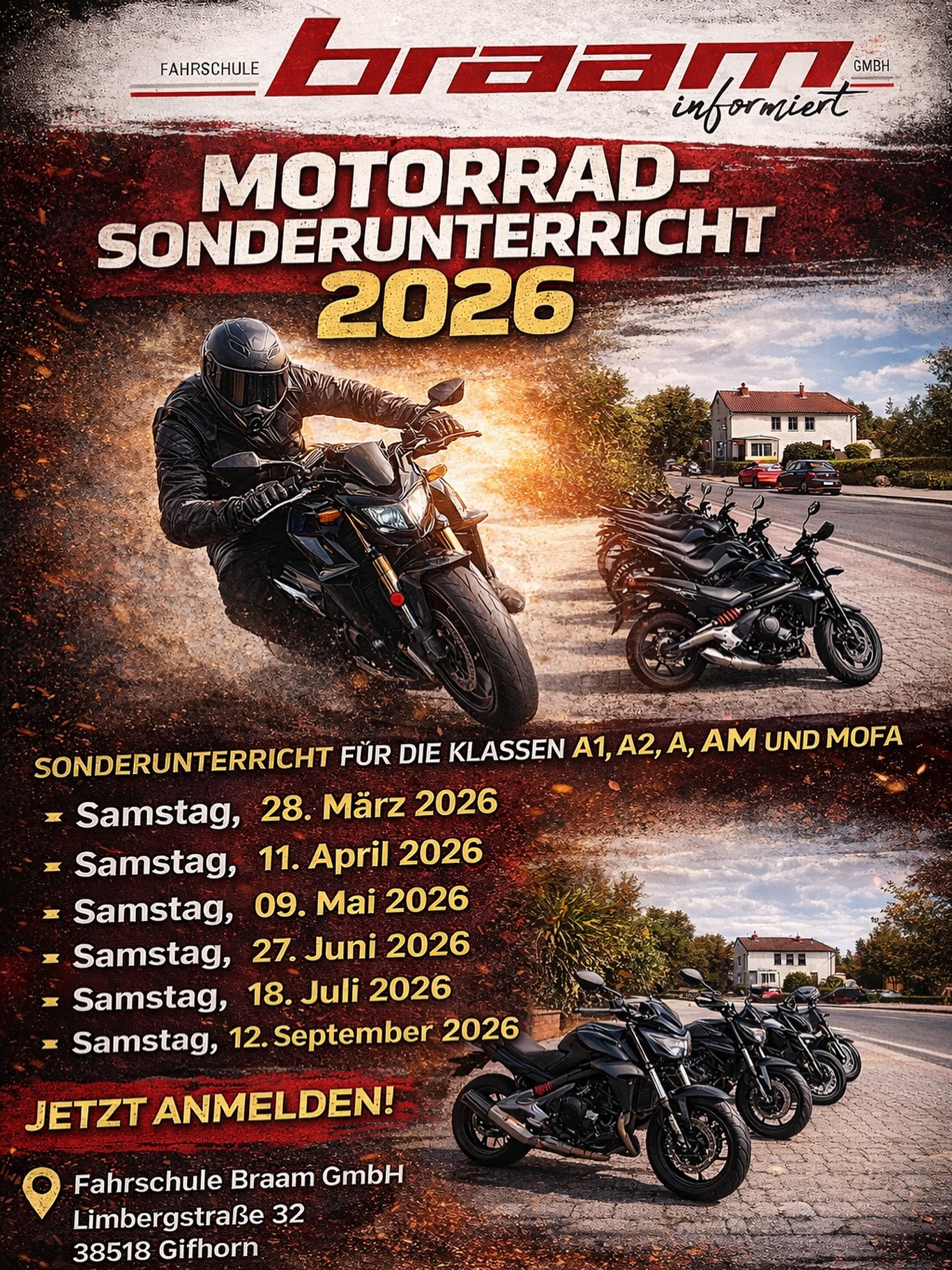Die Sonderunterrichte für Motorrad und Mofa finden in der Hauptsaison ca. einmal pro Monat an einem Samstag von 08.00 bis 15.00 Uhr (Mofa von 08.00 bis 11.15 Uhr ) statt.